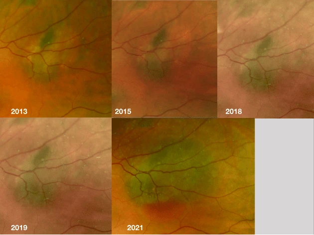 Da han kom i 2017 var det en massiv tumor rundt nervehodetsuperior. Største utstrekning er ca. 5 DD og den ser elevert ut. Det gjorde den også i 2011. Det er tydelig orangepigment på autofluorescence, subretinal væske med avløst makula og nedsatt syn.